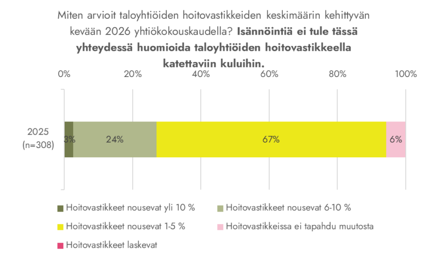 Isännöintiliiton Talousbarometrin mukaan kaksi kolmasosaa isännöitsijöistä arvioi, että taloyhtiöiden hoitovastikkeet nousevat keskimäärin 1–5 prosentilla kevään 2026 yhtiökokouskaudella. Yli 10 prosentin korotuksia ennakoi vain 3 prosenttia vastaajista.