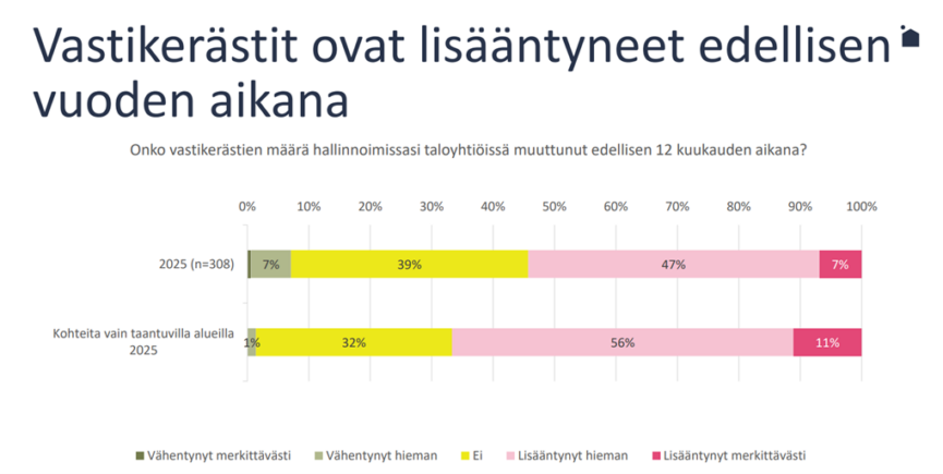 Vastikerästien kasvu ei rajoitu yksittäisiin taloyhtiöihin. Talousbarometrin mukaan 54 prosenttia isännöinnin ammattilaisista raportoi vastikerästien lisääntyneen viimeisen 12 kuukauden aikana.